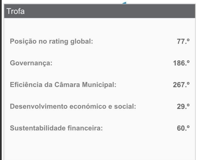 Por outro lado, a Trofa surge na segunda metade da lista dos 308 municípios nos níveis da Governança (186.° lugar) e da eficiência da Câmara Municipal (267.° lugar).