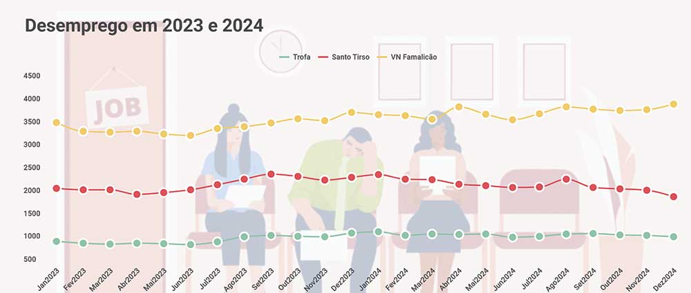 Os dados do Instituto de Emprego e Formação Profissional (IEFP) relativos ao desemprego no mês de dezembro de 2024 mostram uma redução significativa nos concelhos da Trofa e de Santo Tirso em comparação com o ano anterior, enquanto Vila Nova de Famalicão registou um aumento.