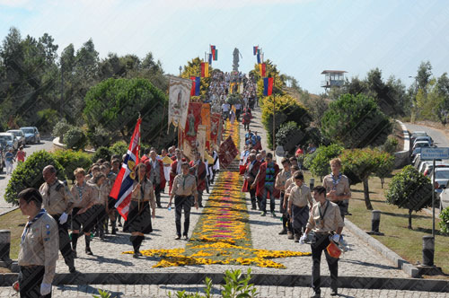 Neste domingo, uma vez mais a procissão saiu à rua, com os escuteiros do Agrupamento 447 de Santiago de Bougado a anunciar o seu início. Seguiram-se as bandeiras representativas das confrarias da paróquia e os andores com as imagens da Senhora da Alegria e de S. Gens.