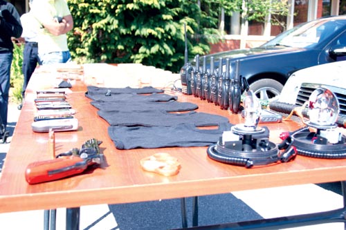 Os militares da guarda apreenderam 15 quilogramas de pólen de haxixe, 20 020 euros em notas falsas, 12100 dólares em notas falsificadas, três viaturas de alta gama e 123 pedras presumivelmente preciosas. “Foi apreendida uma arma de fogo que, à partida, terá sido roubada na zona de Famalicão, muitos cheques, alguns com valores exorbitantes, que se presume terem sido roubados, que seriam utilizados posteriormente em negócios ou supostos negócios”, revelou ainda o Capitão. Nas buscas foram ainda apreendidas seis munições, sete rádios, um GPS, três telemóveis dois pirilampos semelhantes aos utilizados pela polícia, entre outro material. De acordo com o comandante do Destacamento da GNR de Santo Tirso, “a actividade tinha como líder uma pessoa que efectuaria os primeiros negócios servindo de intermediário, tendo outros indivíduos a trabalhar com o principal suspeito para concretizar os negócios”.