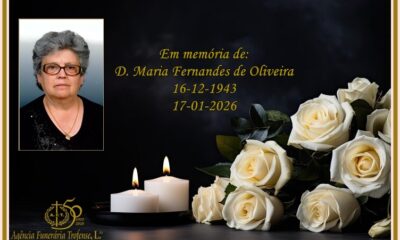 Faleceu Maria Eulália de Oliveira Faria, de 82 anos, residente na Rua Nossa Senhora de Lurdes, Coronado (São Mamede), Trofa. Velório: Sábado, 03/01/2026, a partir das...