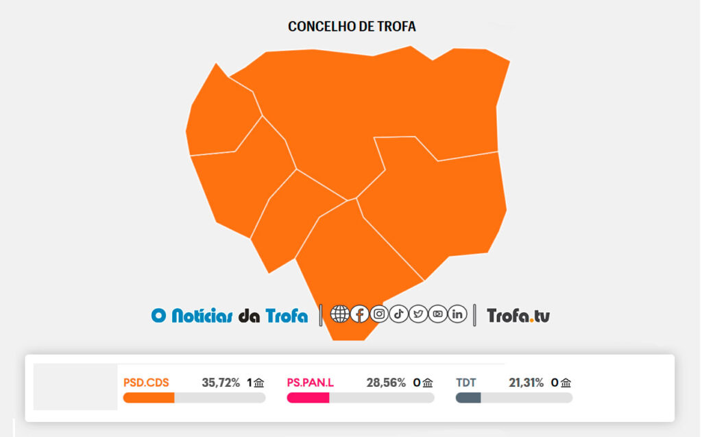 Coligação Unidos pela Trofa (PPD/PSD.CDS-PP) obteve uma vitória expressiva em todas as freguesias e na Câmara Municipal, embora sem maioria absoluta no executivo municipal.