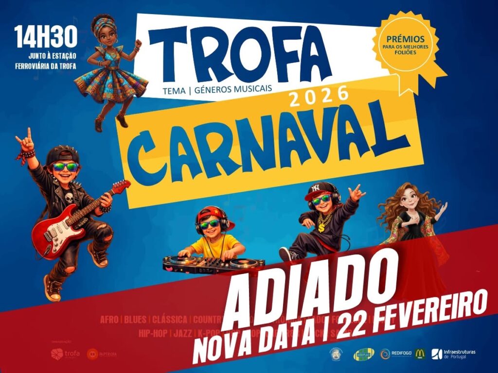A Câmara Municipal da Trofa e a FapTrofa — Federação das Associações de Pais das Escolas do Concelho — decidiram adiar o Desfile de Carnaval da Trofa para o próximo dia 22 de fevereiro, mantendo-se o horário das 14h30 e o local habitual, junto à Estação Ferroviária da Trofa.