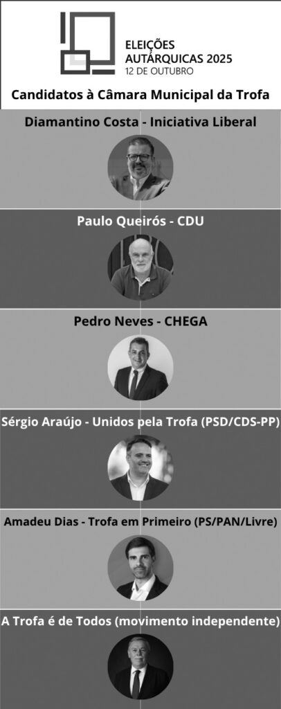 A 12 de outubro, os eleitores da Trofa voltam às urnas para escolher os seus representantes na Câmara e Assembleia Municipal, bem como nas, agora, seis freguesias do concelho. A corrida eleitoral deste ano promete reconfigurar o equilíbrio político trofense, com seis candidaturas a disputar a liderança do executivo municipal: António Azevedo (Independente), Sérgio Araújo (PSD/CDS-PP), Amadeu Dias (PS/PAN/Livre), Pedro Neves (Chega), Diamantino Costa (Iniciativa Liberal) e Paulo Queirós (CDU).