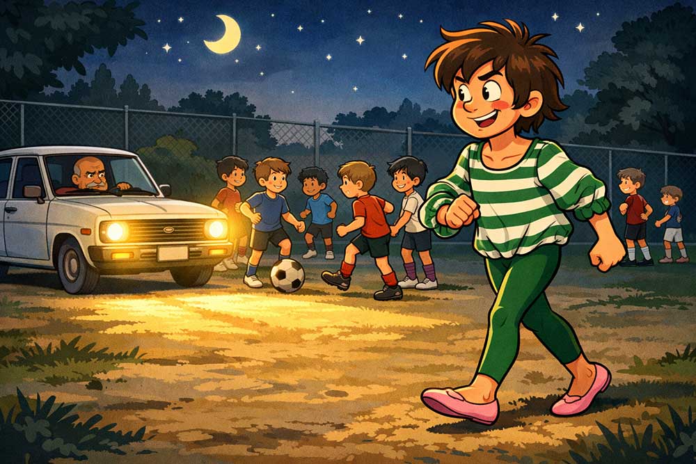 Zé Musgo chega tarde e o campo, cuja iluminação é garantida pelos faróis acesos do Datsun 1200 do treinador, já está cheio de miúdos, entre os doze e os catorze anos.