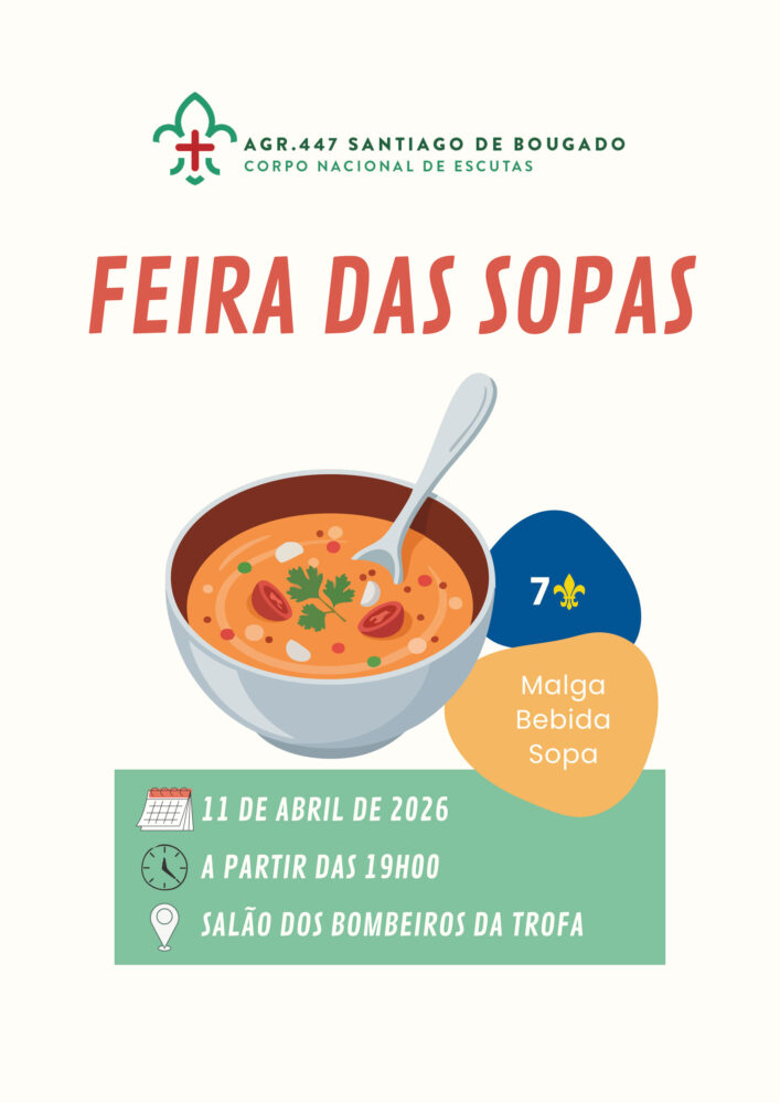 O Agrupamento 447 – Santiago de Bougado realiza, no próximo dia 11 de abril, a partir das 19h00, a 4.ª edição da Feira das Sopas. O evento terá lugar no Salão dos Bombeiros da Trofa e promete reunir a comunidade local num ambiente de convívio e solidariedade.