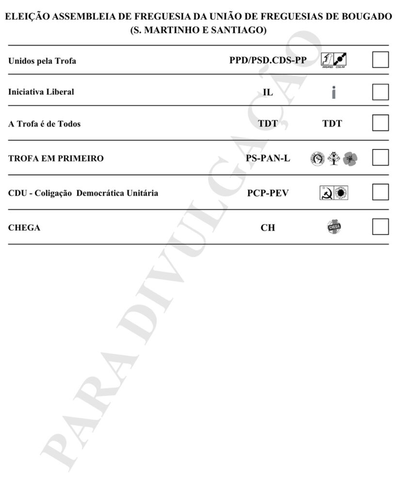 Esta é a ordem do boletim de voto para a Assembleia de Freguesia de Bougado