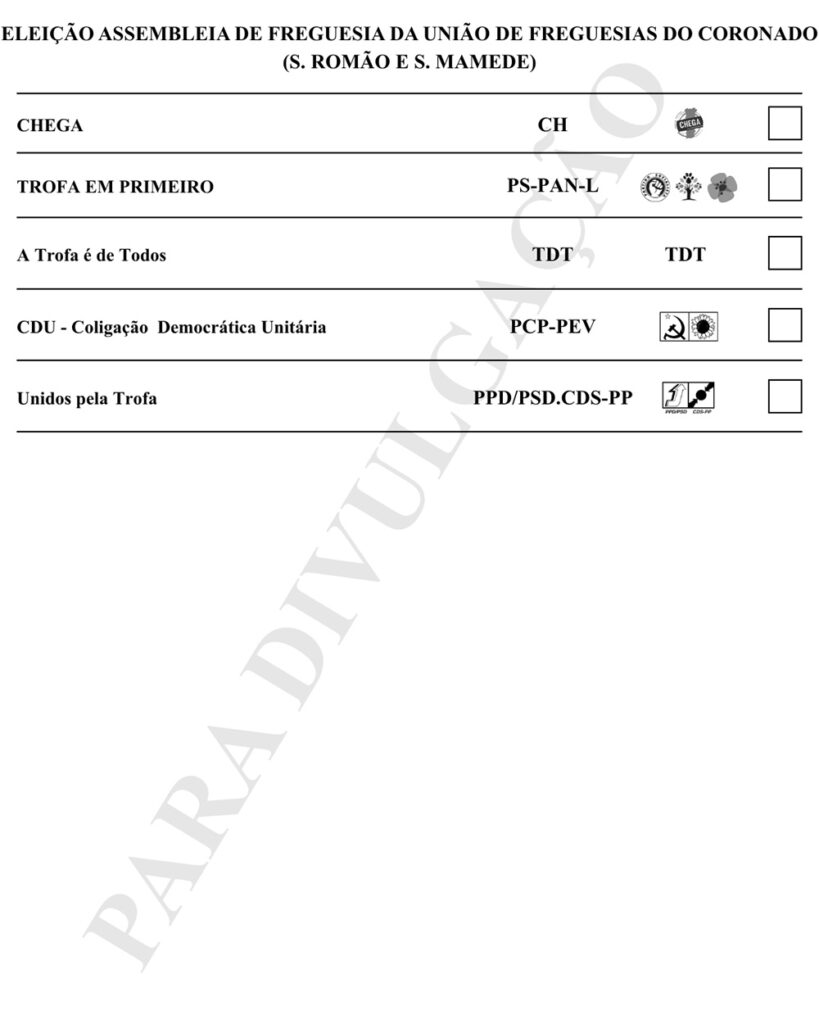 Esta é a ordem do boletim de voto para a Assembleia de Freguesia do Coronado