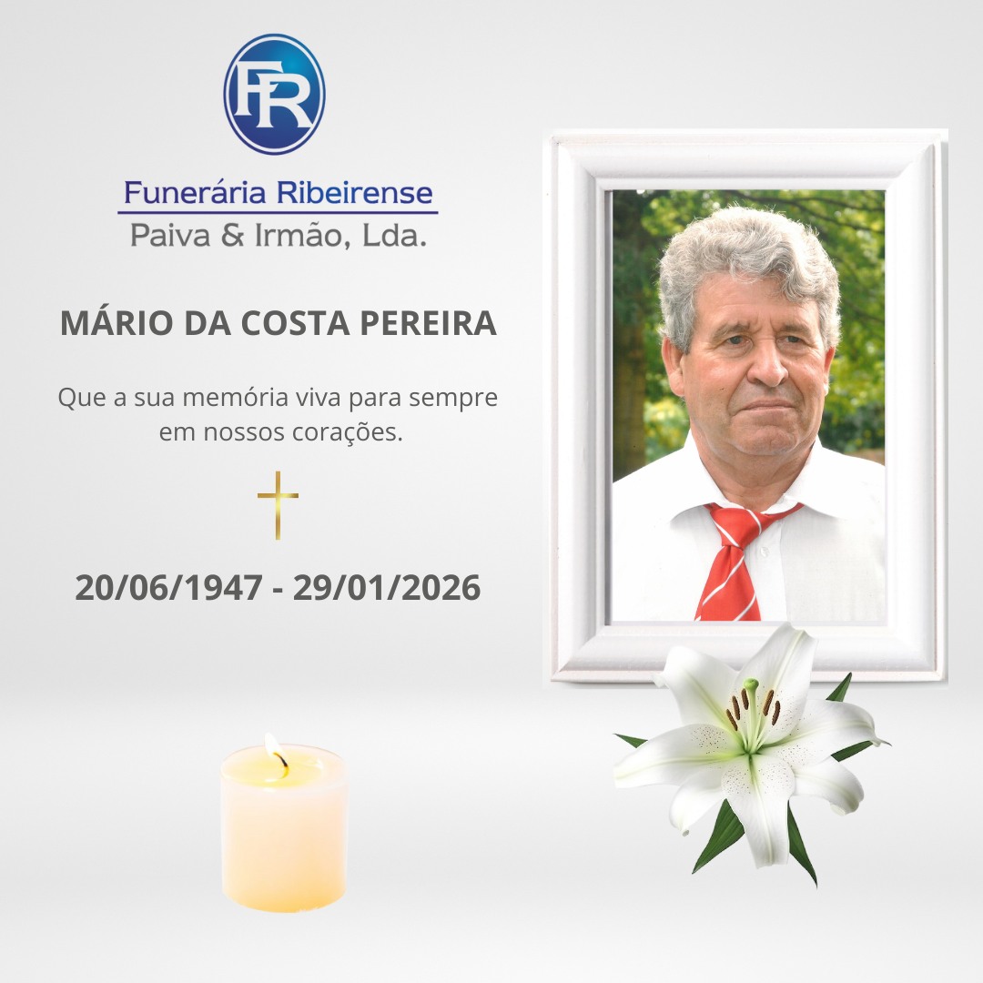Faleceu Mário da Costa Pereira, com 78 anos de idade, marido de Albina Rodrigues Barbosa (D. Bina, ex-Boutique Zellers), residente na Rua Alexandrino Silva Cruz.