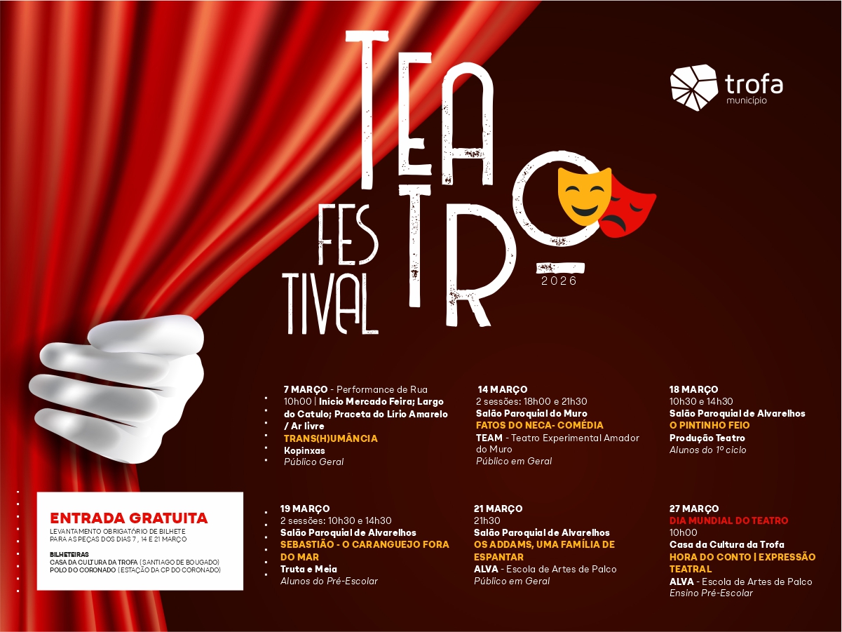 A Câmara Municipal da Trofa anunciou o regresso do Festival de Teatro da Trofa já no próximo mês de março, reforçando a aposta na cultura e no acesso democrático às artes no concelho da Trofa. O evento apresenta uma programação diversificada, gratuita e pensada para públicos de todas as faixas etárias, incluindo este ano uma nova vertente dedicada ao teatro de rua.