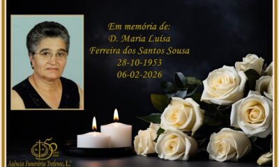 Faleceu Maria Luísa Ferreira dos Santos Sousa, com 72 anos de idade, filha do falecido José da Várzea e esposa de Albino Sousa, residente em Ervosa....