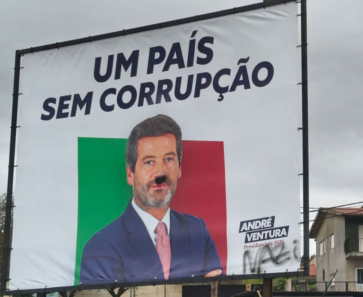 Um cartaz da candidatura de André Ventura à Presidência da República, afixado na rotunda em Lantemil, Santiago de Bougado, foi alvo de vandalismo este fim de semana. A estrutura, pertencente à campanha do líder do CHEGA, apareceu pintada com símbolos e expressões associadas ao nazismo.