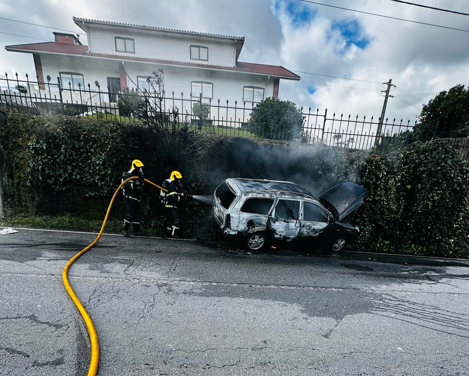 Um veículo ligeiro foi consumido pelas chamas, na tarde deste sábado, na Rua das Indústrias, em Lantemil, Santiago de Bougado, após um despiste seguido de embate contra um muro.